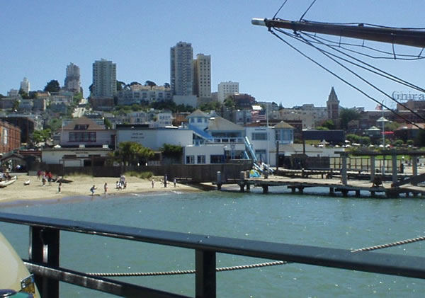 There are two private athletic clubs with space on the Aquatic Park. In this picture they are to the right of the fence. The blue-trimmed one - farthest right - is the