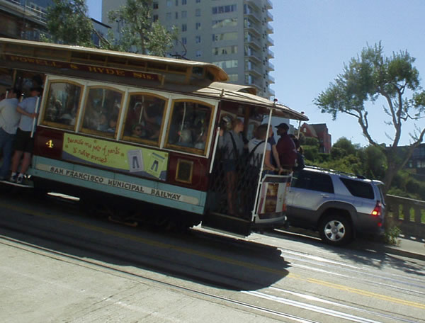 This is one of our friendly neighborhood cable cars. The cable cars a comic reminder of just how silly people can be, masquerading as a technological triumph over nature.