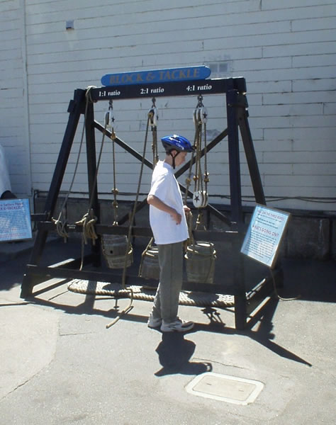 Tote trying to figure out pulleys. Fun display that really didn't explain how pulleys work very well. (It helped to look at how many strands of rope were supporting the weight.)