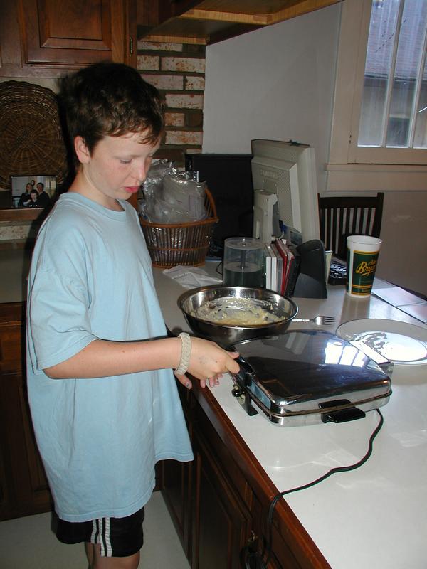 Maggie making waffles (after calling Grandma Hughes for the recipe.)