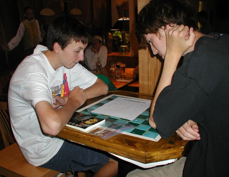 Tote and Duncan playing shogi while waiting for dinner.