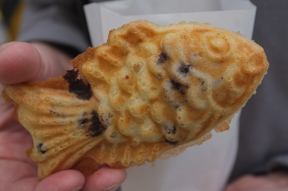 Fried fish? Those dark spots are sweet red beans, not chocolate chips, but delicious. Three fish to a bag.