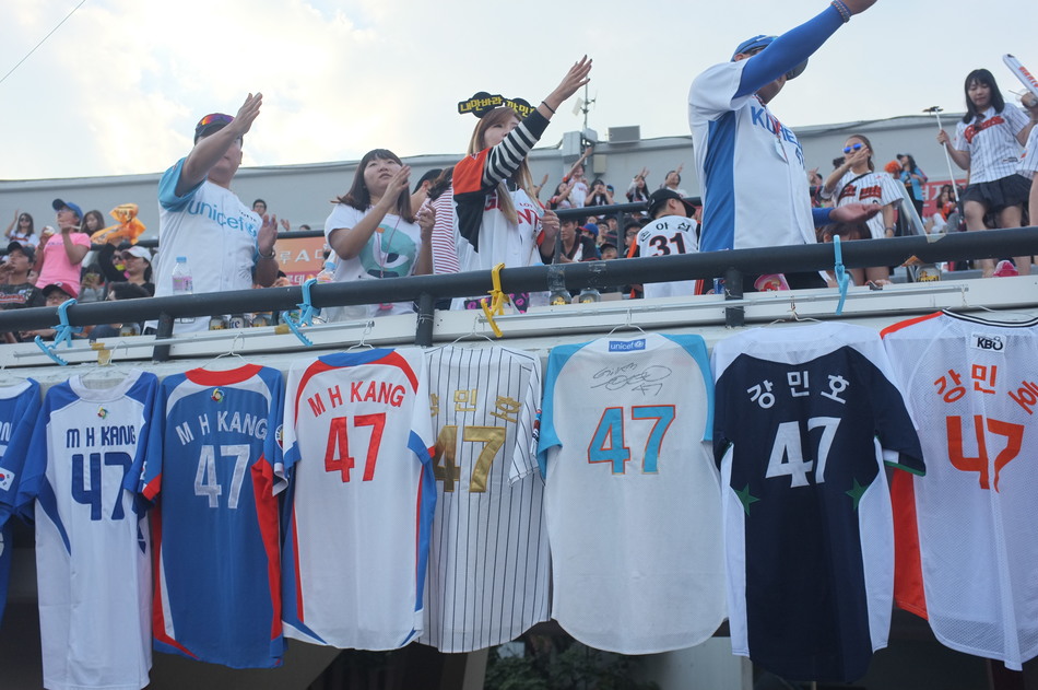 These fans are in the midst of a cheer that involves pointing in the direction of the plate and then to the outfield fence. Kang has played for the Giants for about a decade -- apparently through many uniform changes.