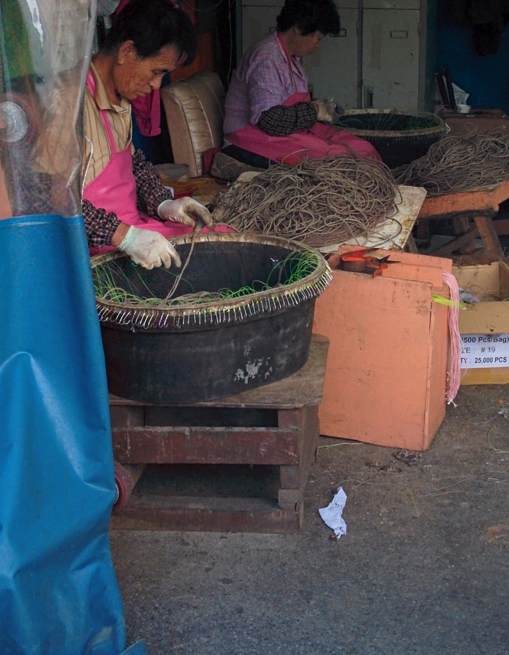 The tackle is prepared in tents next to the docks. Each hook and leader assembled and connected by hand.
