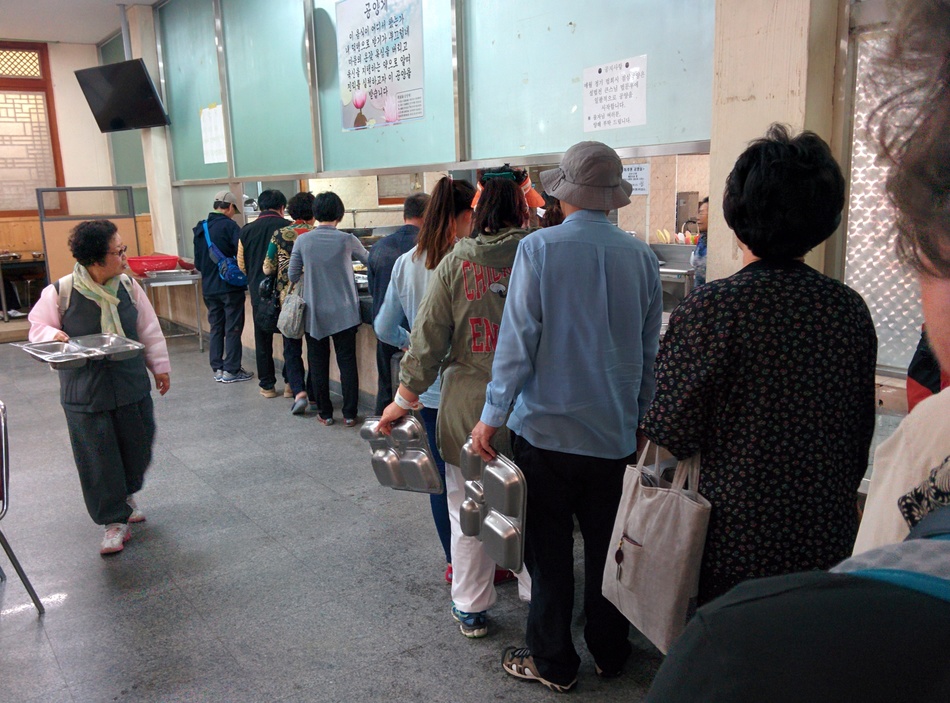 The temple volunteer told us that we should eat the free temple food and at the end of the bus ride, he led us to the large dining room pictured here.  Not fancy.  Everyone else was Korean.