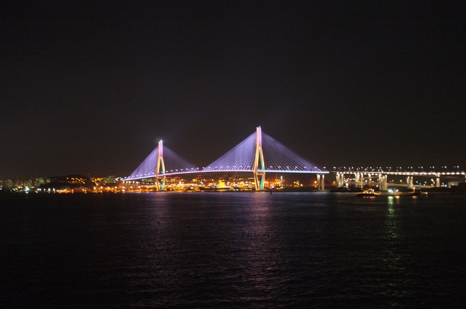 Busan Harbor Bridge. It changes color and flashes. Because the structure is so simple, the light show works.