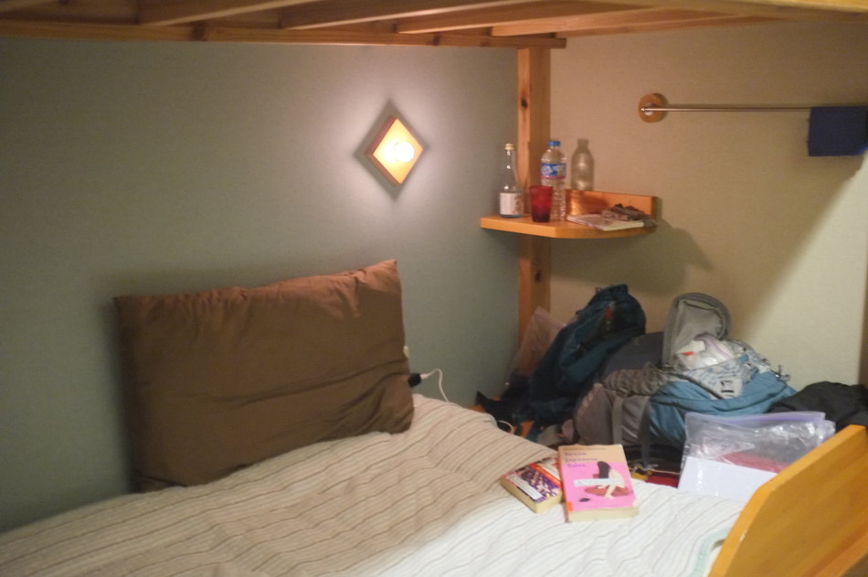 The last two nights at the Aso Hostel, our double room was booked so we moved to a room with two bunkbeds. Monica pronounced her bunk "perfect." This is the foot of her bed, prepared for reading and imbibing before sleep.