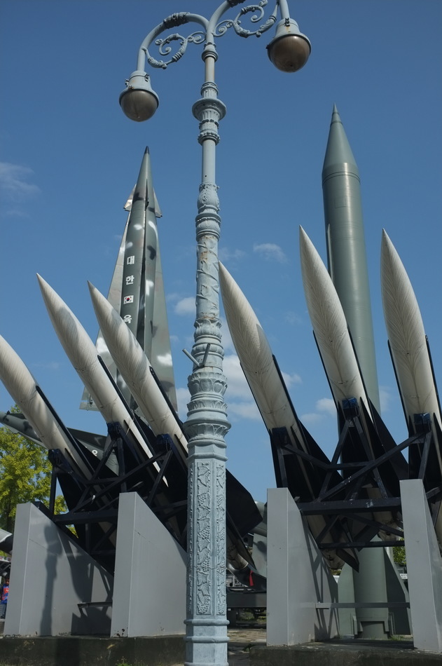 Outside the Memorial is a large collection of military equipment. The white Nike missiles were deployed at many sites in the U.S. to stop Soviet bombers. There was a battery at "The Point" near University of Chicago.