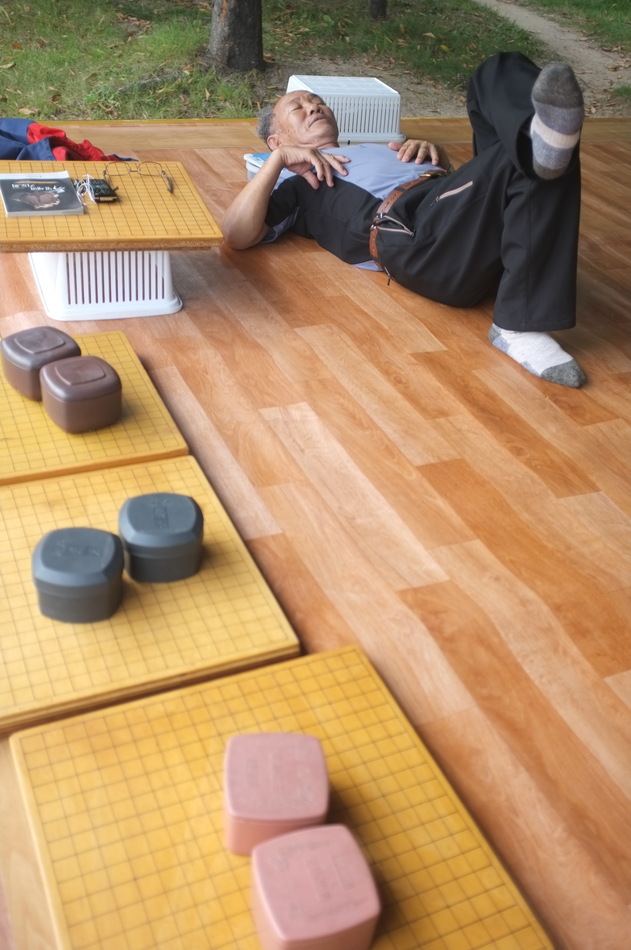 Playing Go forces one to contemplate the cosmos, one's place in the universe, and the meaning of life. Or maybe he's just taking a nap.
