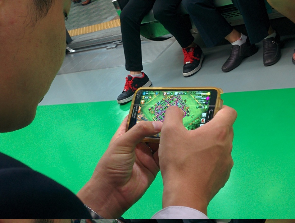 Clash of Clans on the subway, being played by a well-dressed, serious-looking fellow.