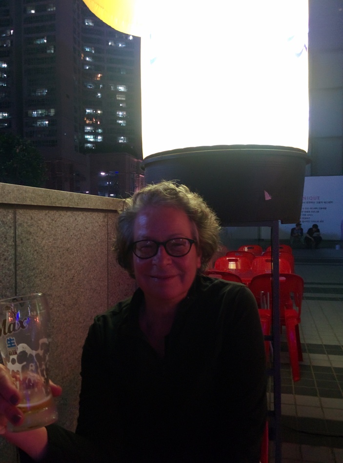 Happy Monica after chicken and beer dinner.