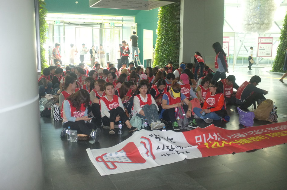 A well-behaved demonstration by call center workers in the lobby of City Hall. They were simply sitting their quietly with their matching vests. Each spot had a flat pillow and water bottle.