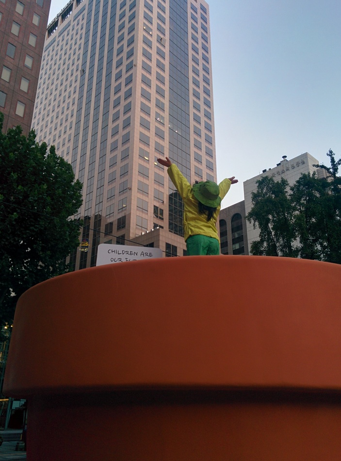 This is a sculpture of a little girl "sprouting" from a flower pot.