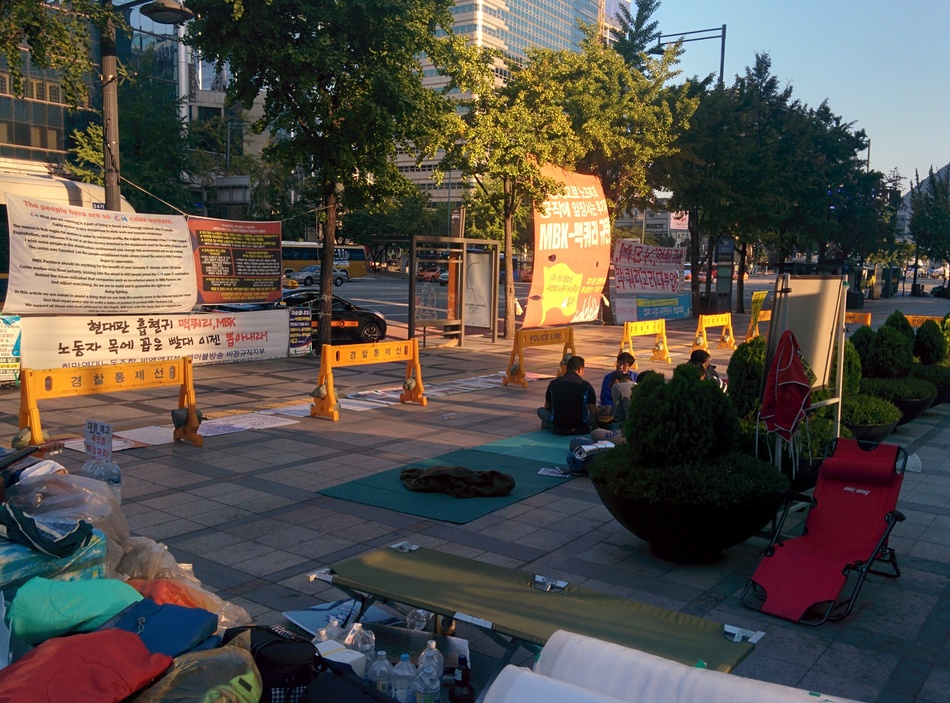 Another labor strike. This one was also quite quiet. I believe many of these fellows stay here all night amidst their banners.