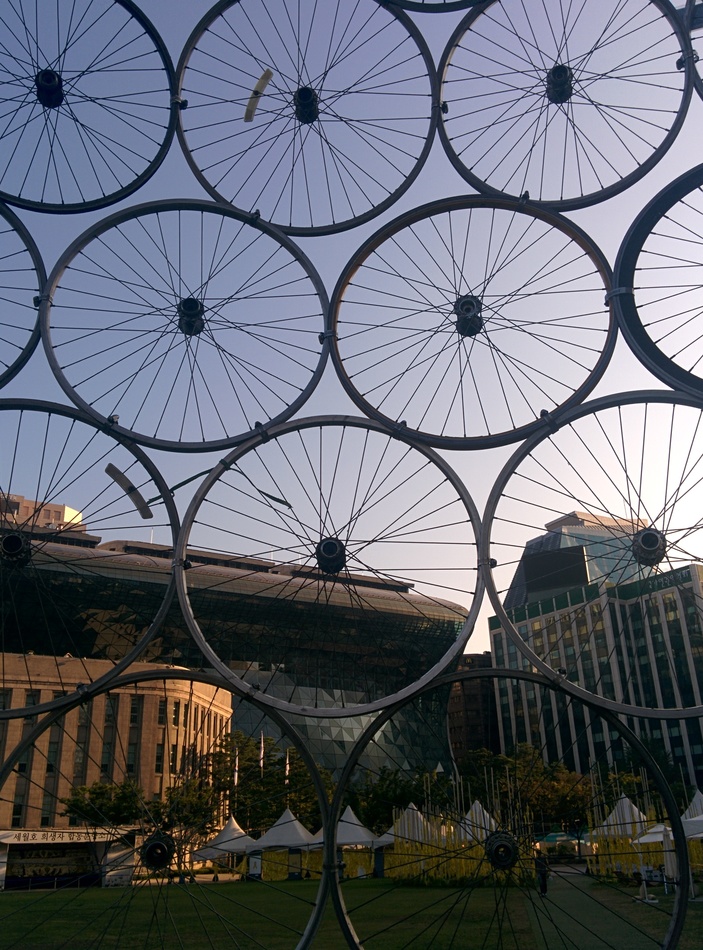 Bike wheel sculpture and City Hall.