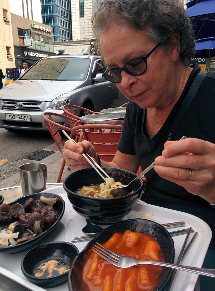Lunch at a cafe. Liver sausage (soondae) with slices of liver, noodles, dak poki (somewhat like gnocchi), and miso soup with seaweed.