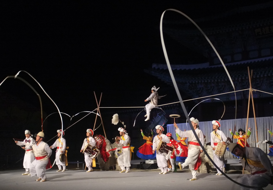 The finale. The girls in the earlier photo are in the back row. The dragons are just ready to pop out and a couple other performers aren't visible. The tightrope guy was bouncing up and down on his tightrope.