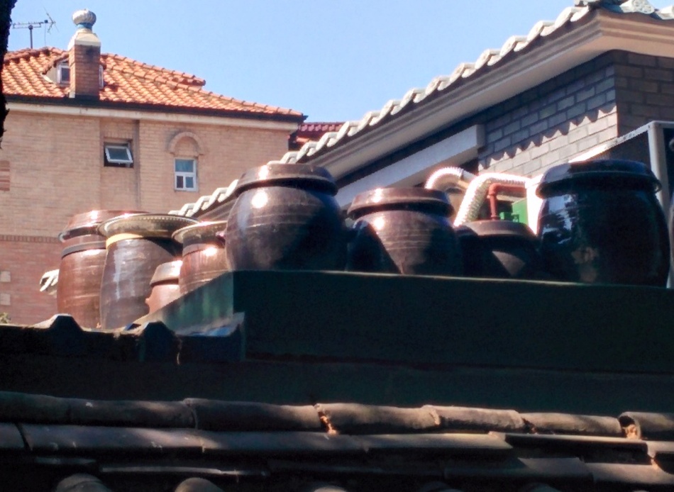What we call kimchee pots on a roof. We learned that they are used to create and store different kinds of sauces and food.