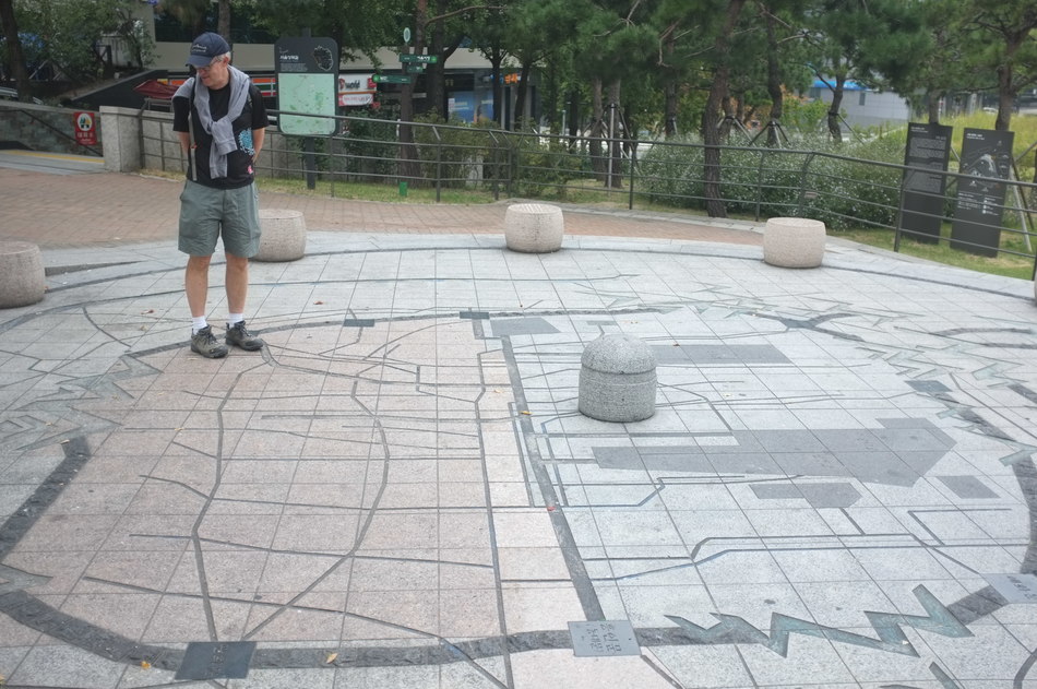 This is a map of the fortress walls. The jagged line on my left is Namsan mountain. The larger mountains are to my left. I am standing on the map close to where we on the wall trail.