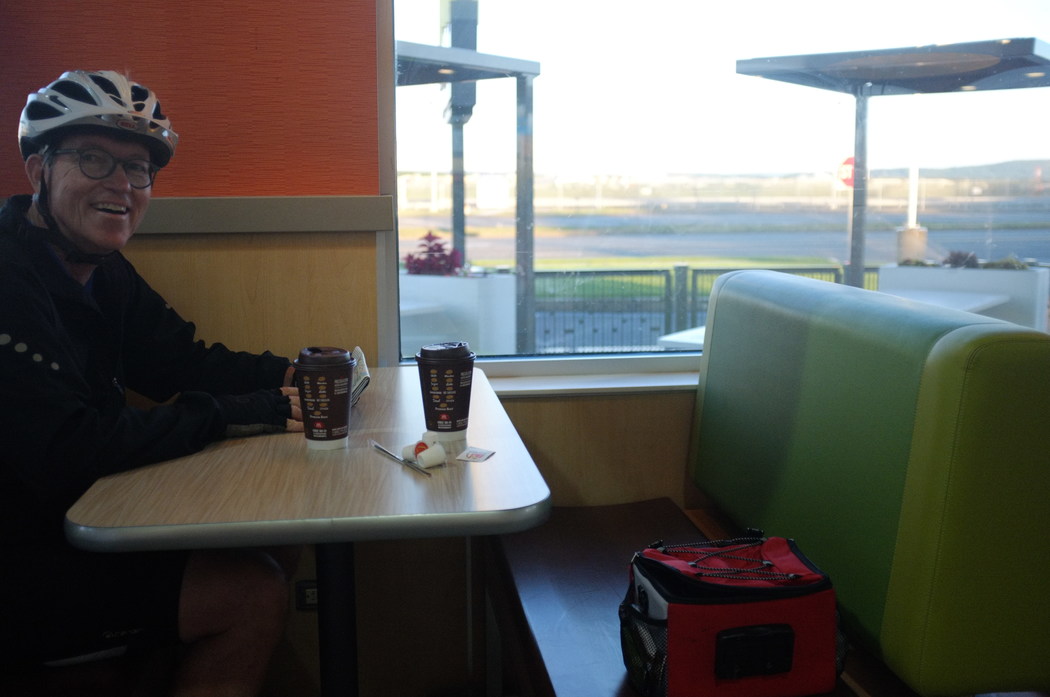 High class folks always stop for their morning coffee at McDonalds and wear their helmets for safety.