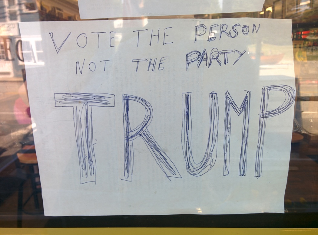 First Trump sign. I'm not sure what the injunction "vote the person not the party" is about. Perhaps the author thinks there are a bazillion Democrats who like Trump but won't vote for Trump because Trump is a Republican. Laughable, you say? But is any belief too irrational for someone who is disconnected from reality so much as to think Trump would be a good president?