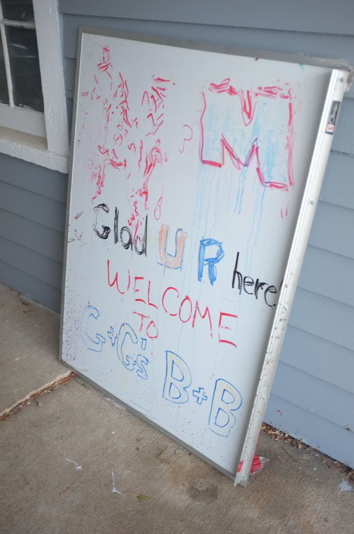 Mark's mother prepares a welcome sign every time we visit. This one looked good until it was caught in the rain. Or maybe, Mark's mother only likes Monica.