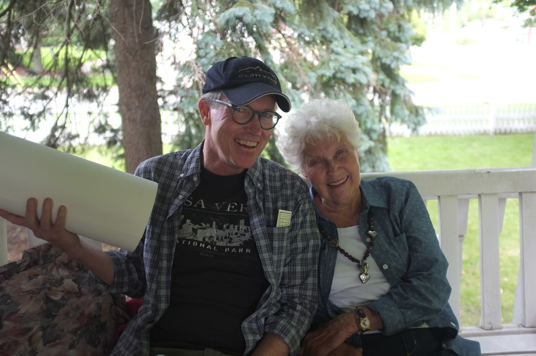 Mark and his mom. Mark is just back from visiting with one of his friends in DeKalb -- the fellow who has run North Central Cyclery for years. That's a poster in his hand and a bookmark in his pocket -- parting gifts. His friend is leaving the bike shop to do other things.