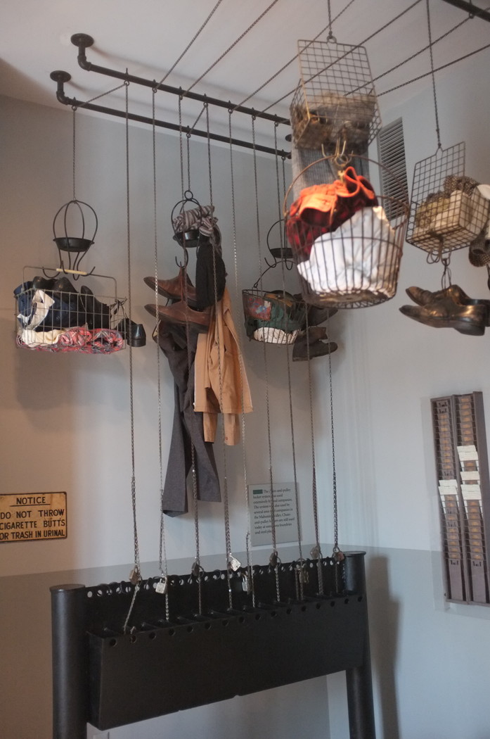 Locker room. The hooks would be drawn up far out of reach with the chains which a worker would then lock with a tiny padlock.