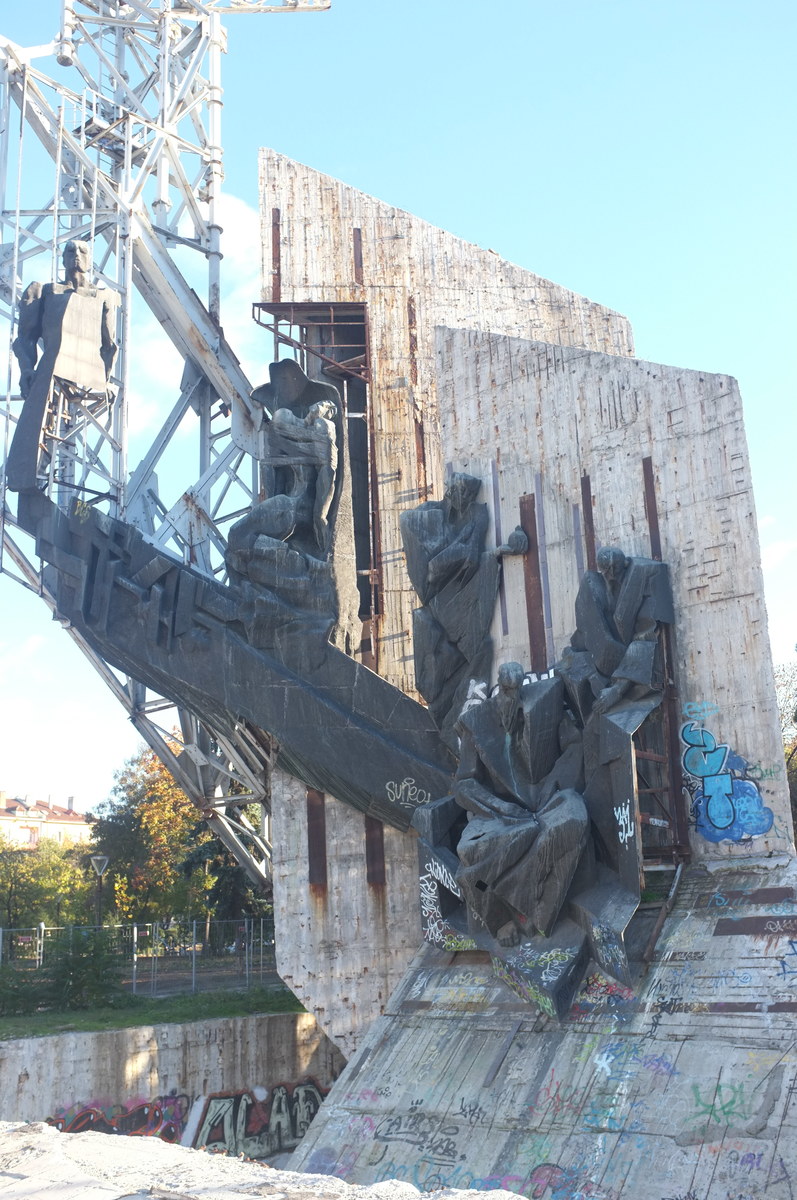I was wrong both times. This is the 1300 Years Bulgaria Monument. It was built in 1981. The building was done in eight months, so the monument could be completed in time for the opening of a party congress. Shortly afterwards, the stone sheathing started falling off. To prevent harm, after the Berlin Wall came down, the city surrounded the monument with a fence.