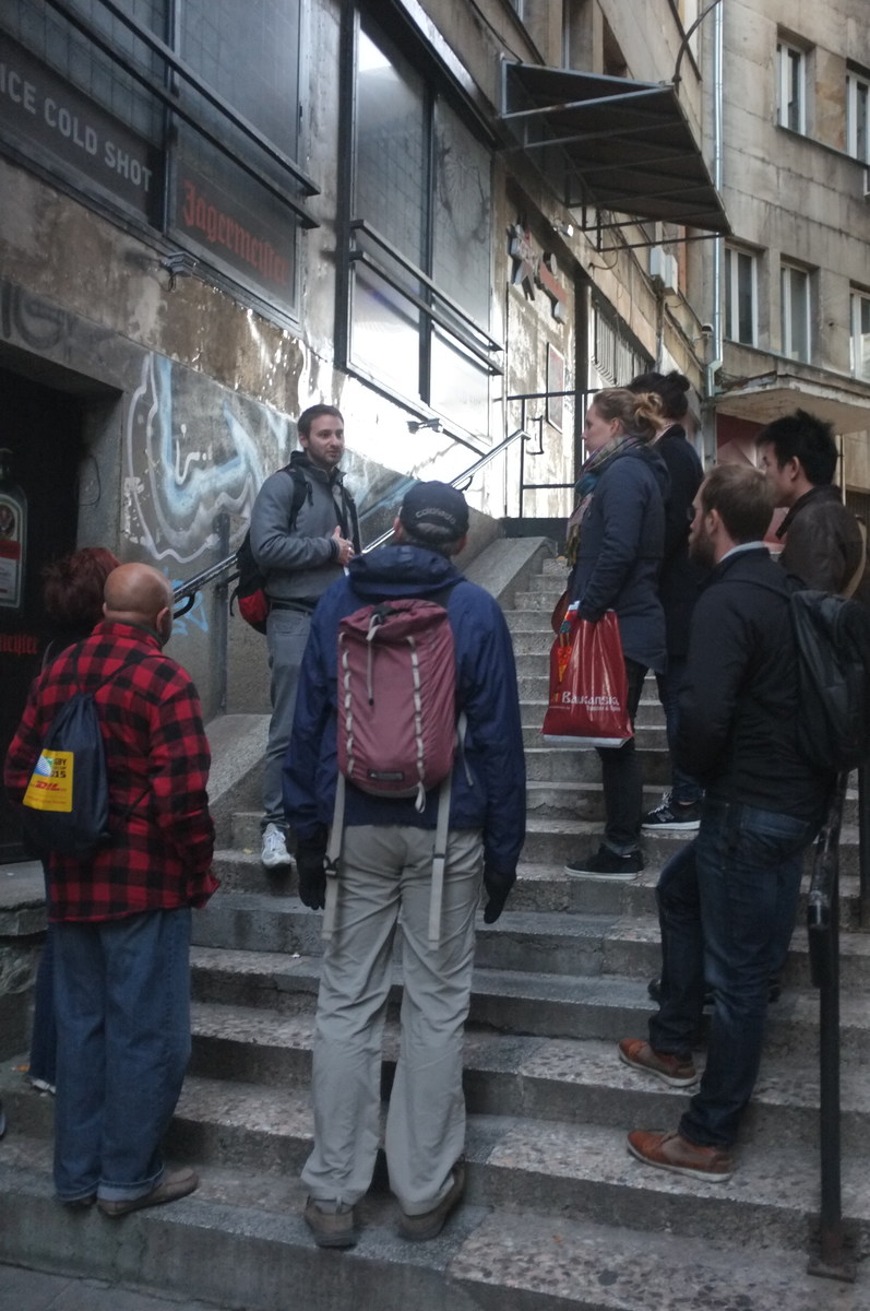 Our Communist Tour standing outside a steel door through which people were supposedly taken to be interrogated or disappeared. The door now has a big Jagermeister sign on it.