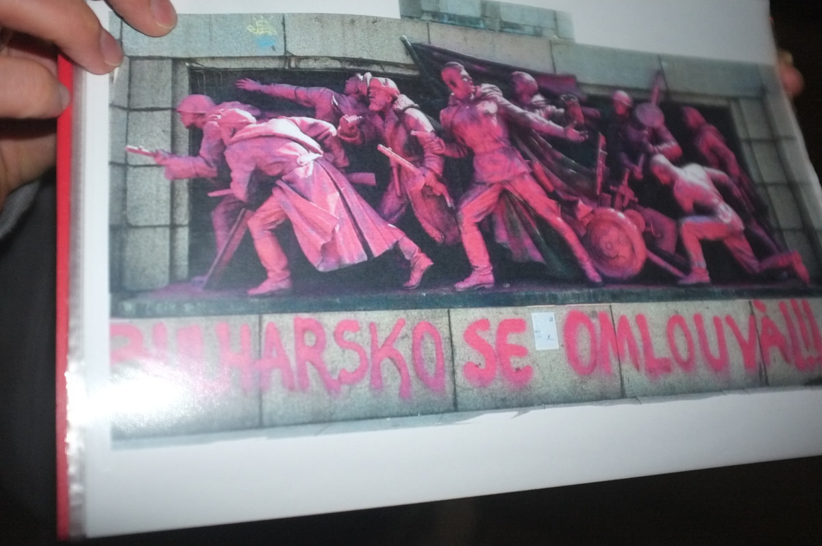 The painted inscription says, in both Bulgarian and in Czech, "Bulgaria apologises."