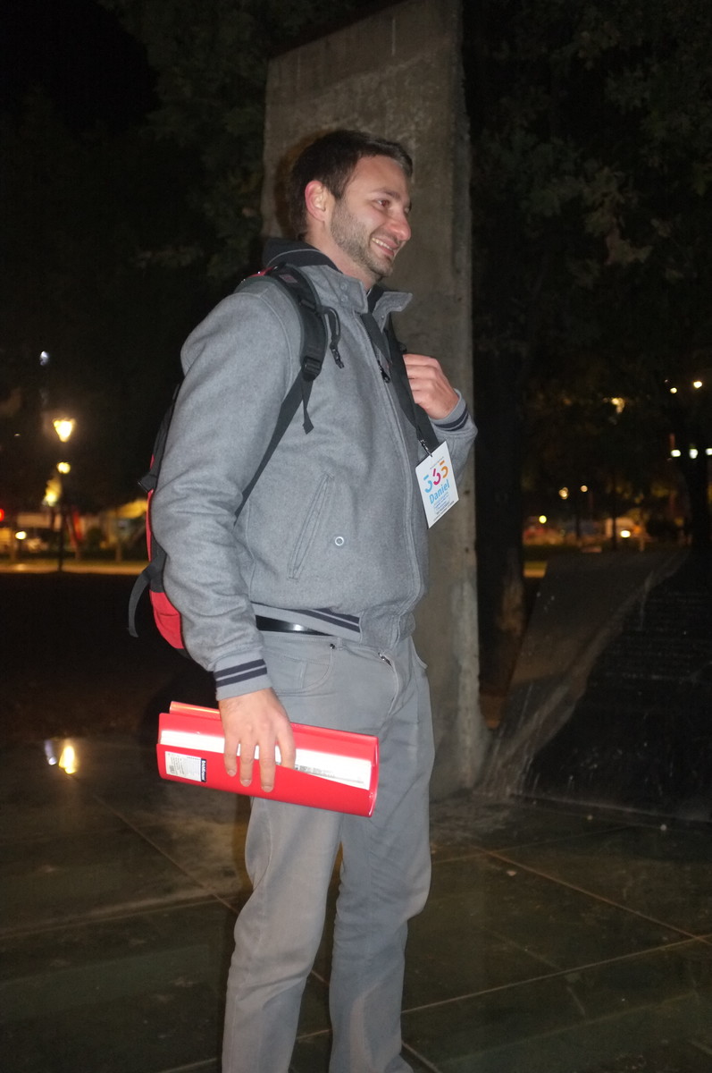 Our guide at the end of the tour, standing before a chunk of the Berlin Wall.