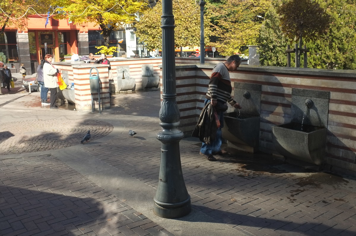 Around the corner from the baths is a place where mineral water runs from many taps. People were filling all sorts of containers while we watched. The water is very warm and tasted faintly salty with a very slight sulfur smell.