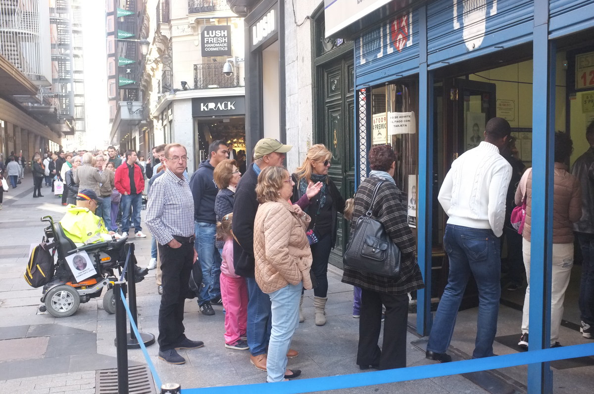 This is the front of a huge line of people waiting to buy lottery tickets. Spain's Christmas lottery was first held in 1812 and has been held continuously since then. Based on payout, the Spanish Christmas Lottery is the largest in the world. Most people have a piece of a ticket. (Tickets cost 200 Euros, but one can buy a tenth of a full ticket or, through private groups, a smaller fraction.) First prize is called "El Gordo."
