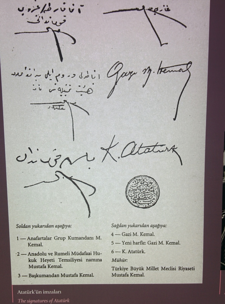 Ataturk took honorary names as he went through life. And his signature shows the Ataturk-mandated switch of Turkish from Arabic to Roman script.