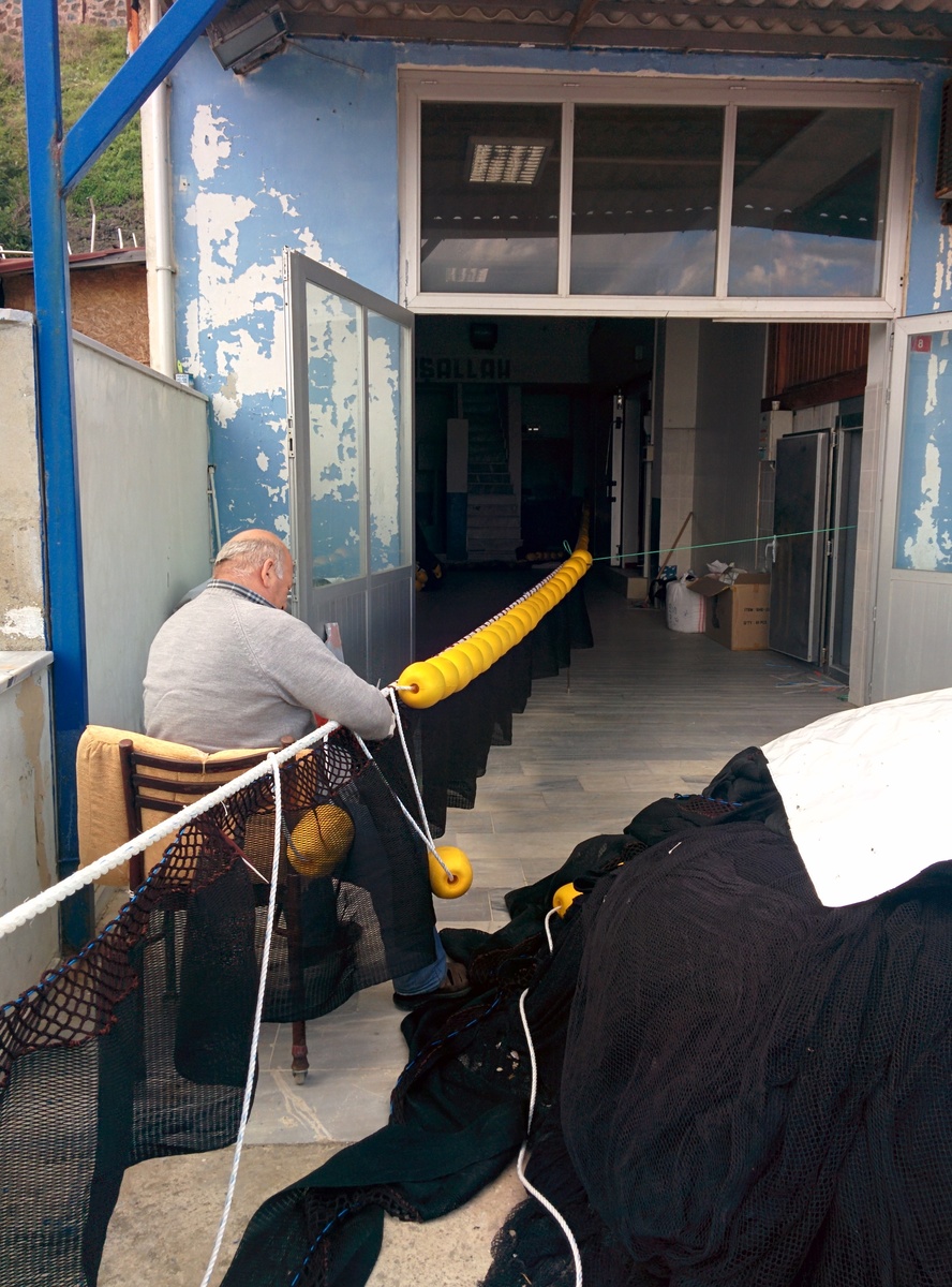 Putting floats on a fishing net.