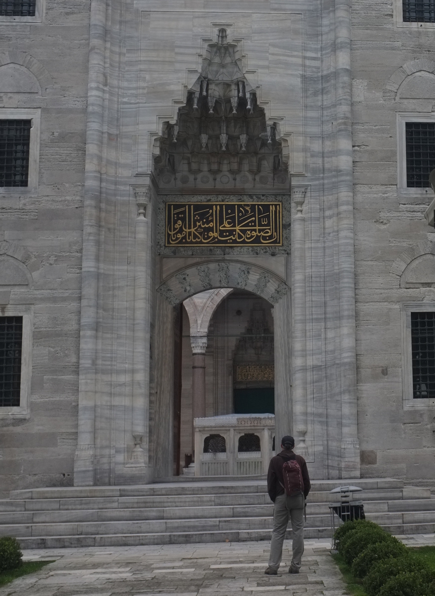 Admiring the entrance to the courtyard of the Süleymaniye Mosque. This mosque is a landmark on the skyline of Istanbul and one of the most famous works of the Ottoman's most famous architect, Sinan.