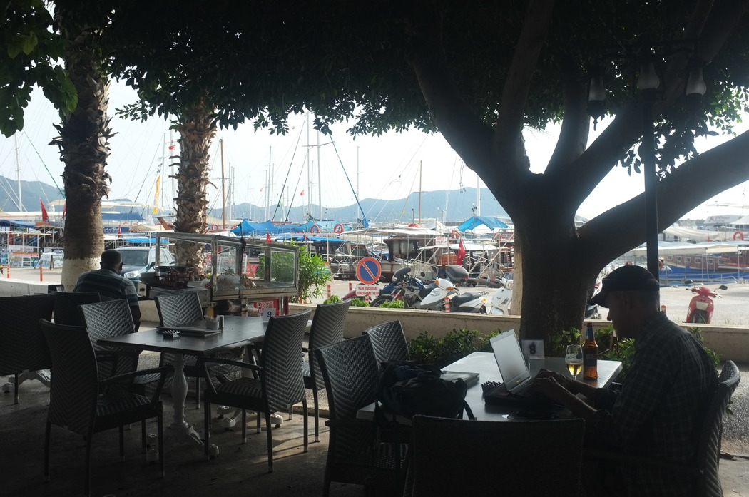 Probably doing captions for pictures. A relaxing place to do it.