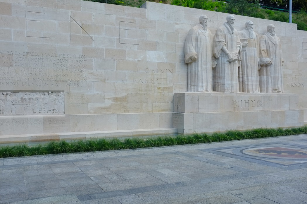 This is the Reformation Wall. These four statues, in the center are William Farel, John Calvin, Theodore Beza, and John Knox. There are an additional six statues of other Reformation folks on either side of these, including Oliver Cromwell but excluding Martin Luther.