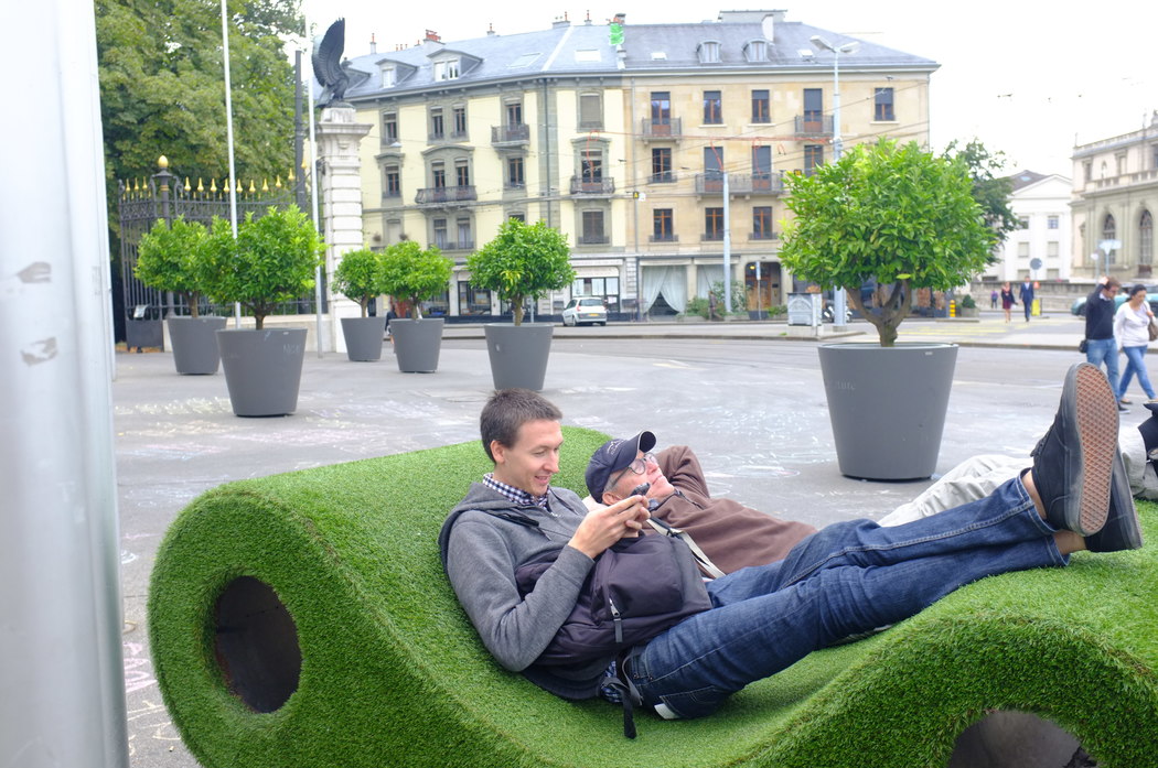 These cool "couches" are in many public spaces in Geneva, and usually they were full of people. Tote says they are removed in the winter.