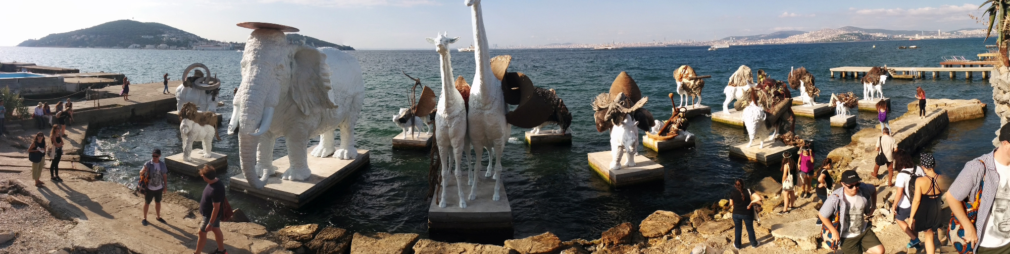 It's interesting and impressive on its own, but for us the effect was trebled by the setting and approach to the work. The map location is described as Trotsky's House. (Trotsky was exiled to Turkey in 1929.) When we arrived, we were directed down a tunnel-like path in a a scrubby area with weedy shrubs and bushes over our heads. The path wound in the shade past the ruins of Trotsky's house. Eventually, we could see a gate that opened on the sea. When we walked through the gate, this is what we saw.