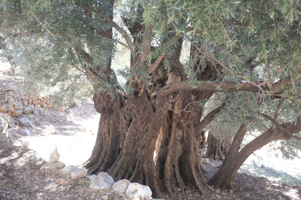 An ancient olive tree. We stopped here for awhile because we couldn't find the next waymark. Within twenty minutes, three more hikers joined us in wandering around looking for the trail -- the Turkish hiker I misdirected two days before and a heavily laden German couple, Johanna and Johannes. I eventually found a faded, nearly invisible, waymark and then the next one.