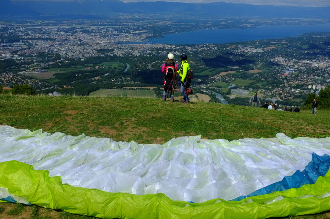 Salève is a popular place for paragliding. These people will go together. The fellow in the flourescent jacket knows what he is doing; the other will be a passenger.