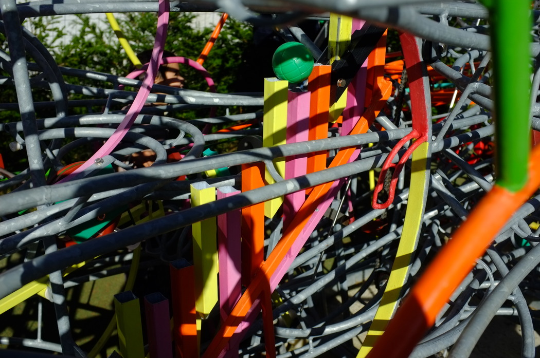 Several balls roll, roller coaster fashion, around on the grey tracks. There are complicated cranks, pedals, and levers to get the balls up and ready for another step in the descent. Perhaps a half dozen people could play with this thing at one time.