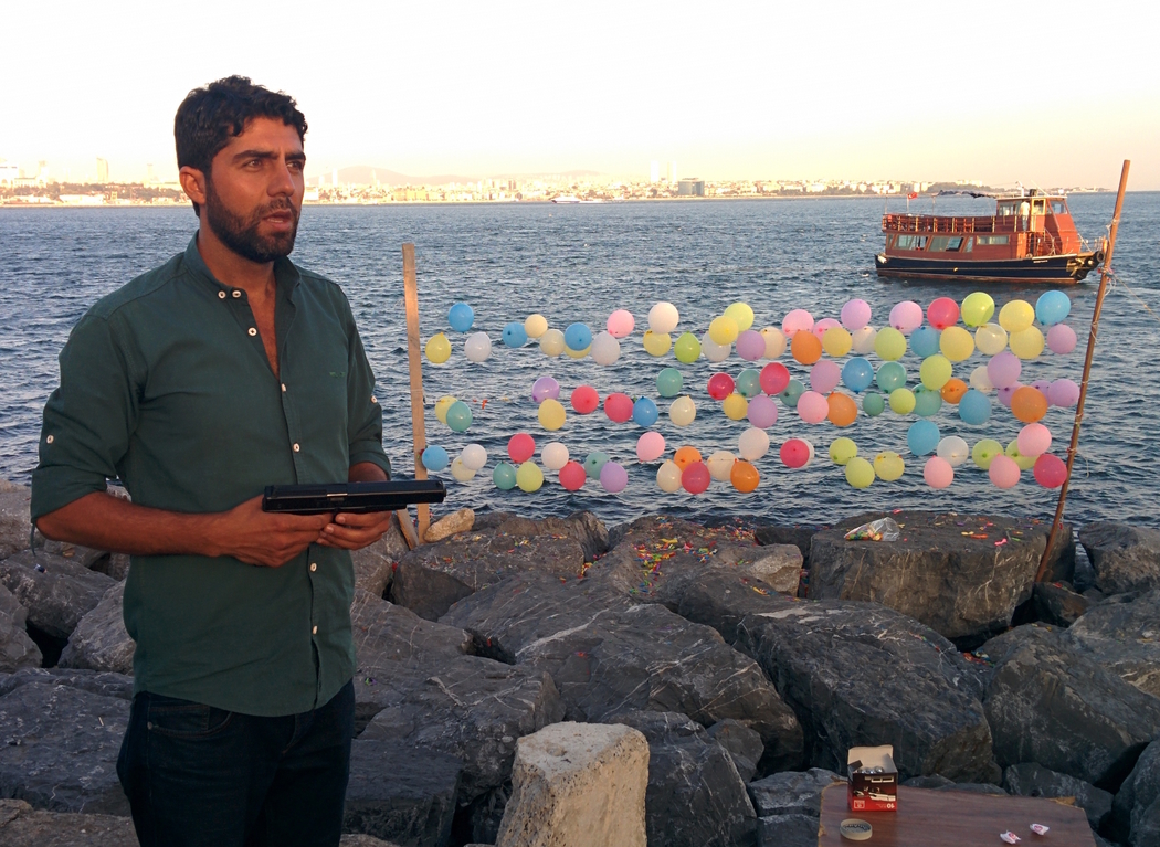 That's the Bosphorus and Asia behind this fellow's shooting gallery.