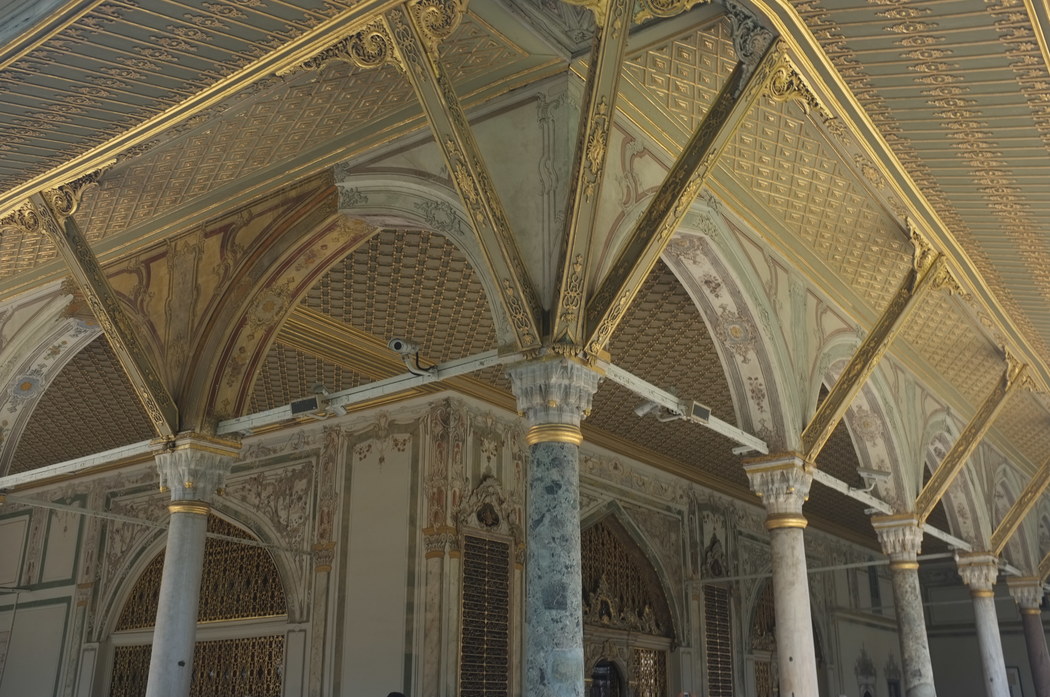I found the architecture interesting. The interior of the Council Chamber is separated from outsiders only by gilded grids. So, in some ways the deliberations of the Council were non-confidential and public. There's a contemporary description of thousands of people standing quietly in the courtyard while discussions were underway. Yet, the architecture also coincides with the sultan's ultimate power. He followed the Council meetings from a grilled window which kept him literally separate and above the proceedings. Although he had delegated some powers to the Council, he remained the ultimate authority.