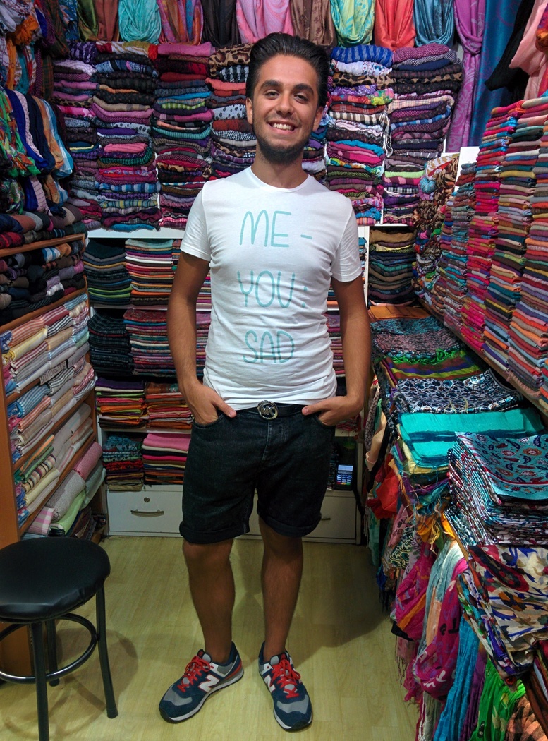 I complimented this fellow on his T-shirt. He responded that he had bought it at a mall. "It's authentic. Not like the fake ones here."
