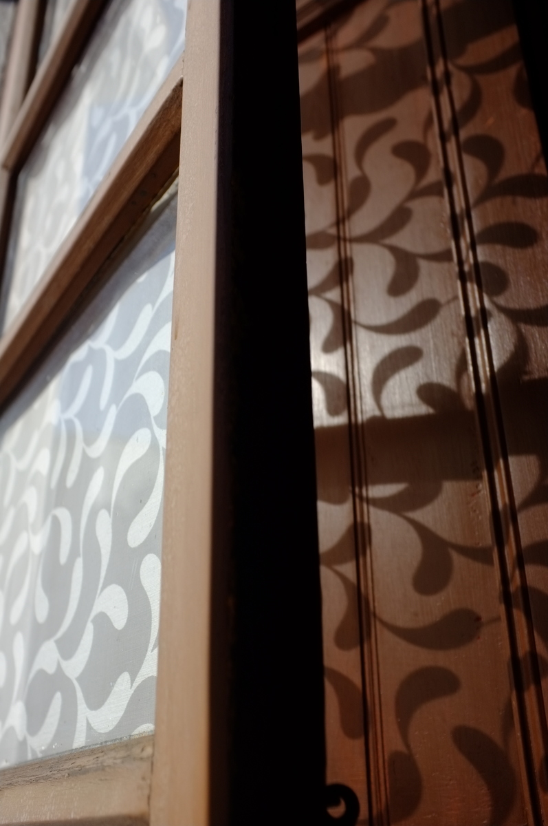 Shadows from the curtains on our room's shutters. Our room was beautiful: old shutters, colonial floor boards, and nicely decorated.