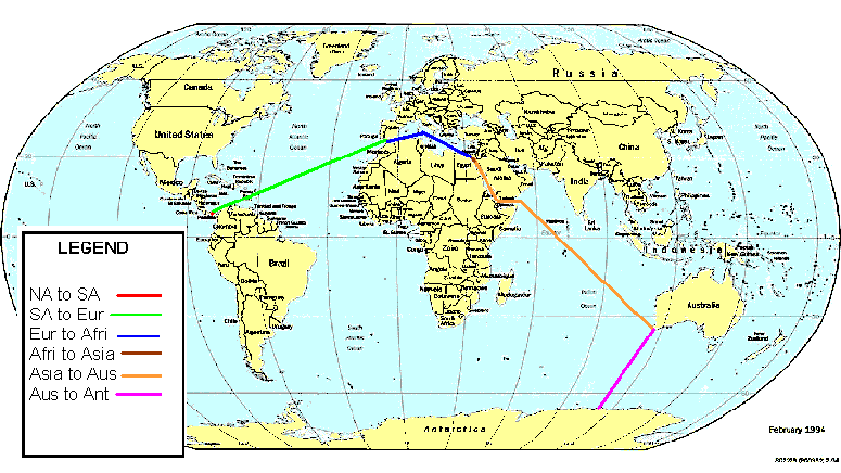 I had Mr. Sala start in the middle of the Panama Canal. That way he could be in North America and South America at the same time. That's the same reason I had him go through the Suez Canal. I chose this path for Mr. Sala's kayak trip: