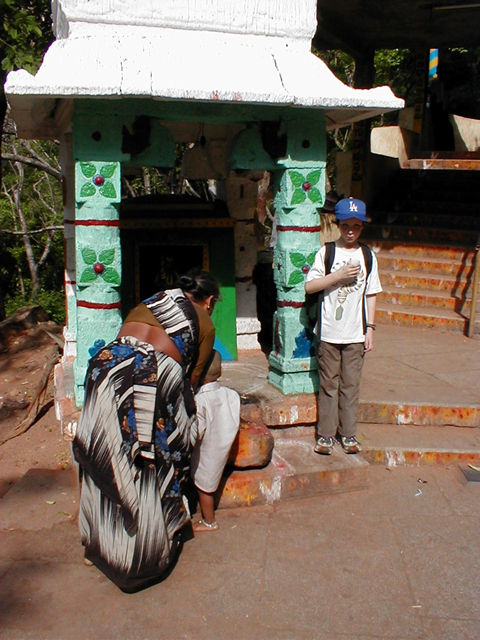 Maggie with a glass of tea outside a shrine. (Maggie was here, and Monica had started taking the photo when the worshipper suddenly appeared.) |